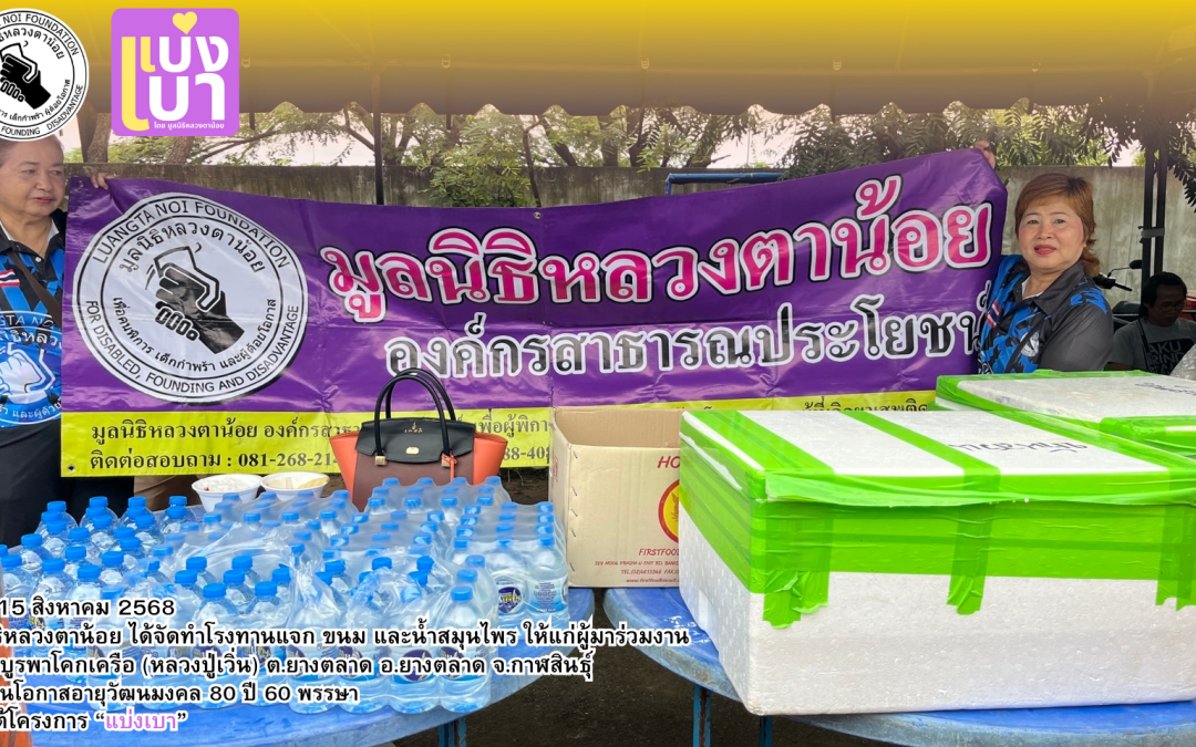 ด้วยความตั้งใจที่จะร่วมแบ่งปันรอยยิ้มและความสุขให้แก่พี่น้องผู้มาร่วมงานในครั้งนี้ มูลนิธิหลวงตาน้อยรู้สึกซาบซึ้งใจที่ได้เป็นส่วนหนึ่งของงานบุญใหญ่ และดีใจที่ได้เห็นบรรยากาศแห่งความอิ่มเอมและความสุขร่วมกัน